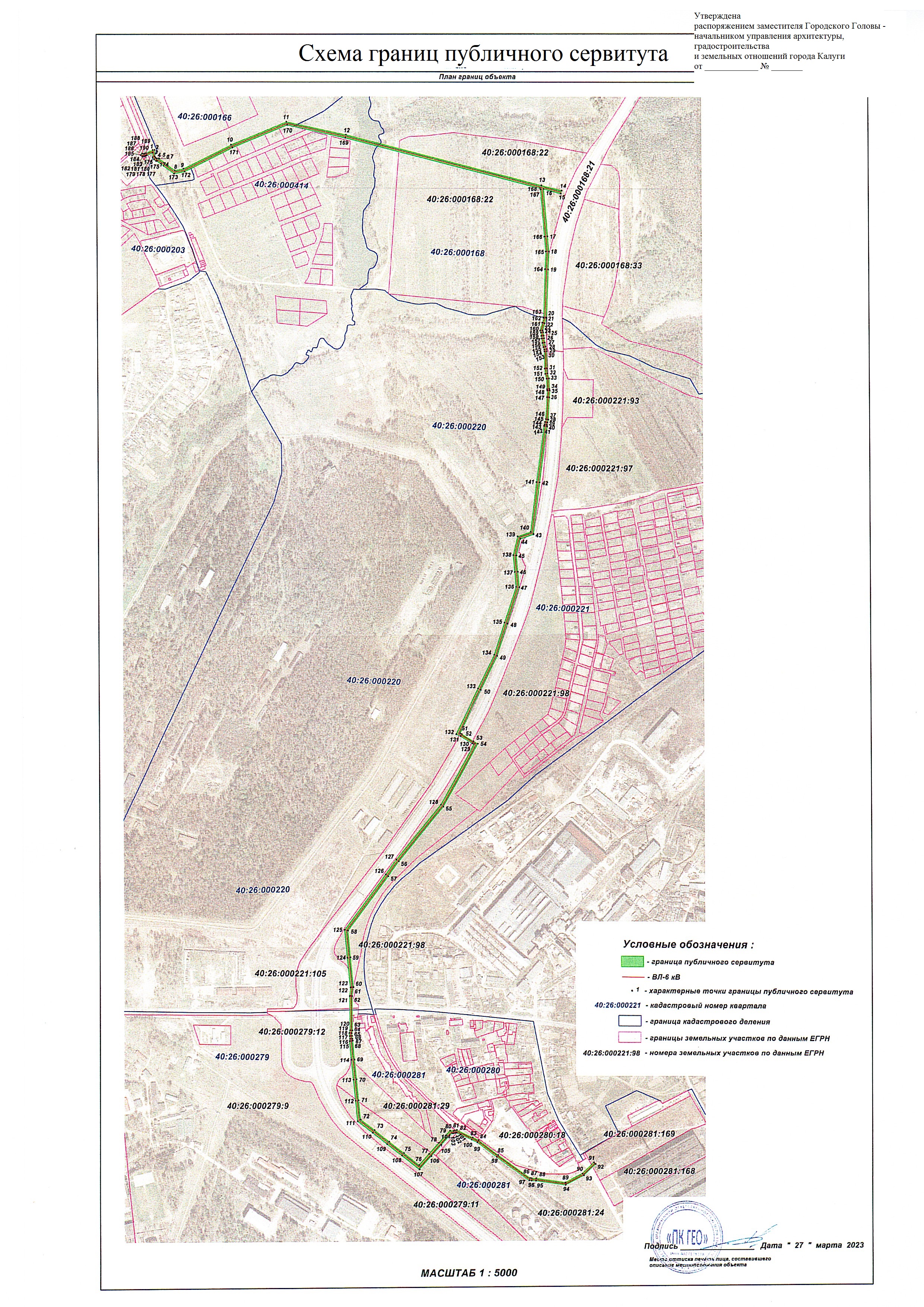 Управлением архитектуры, градостроительства и земельных отношений города Калуги рассматривается ходатайство Публичного акционерного общества «Россети Центр и Приволжье» об установлении публичного сервитута в отношении земель и земельных участков с кадастровыми № 40:26:000166, 40:26:000414, 40:26:000220, 40:26:000203:10 (входит в состав единого землепользования 40:26:000000:12), 40:26:000203:32, 40:26:000000:2165, 40:26:000000:2328, 40:26:000000:2379, 40:26:000168:22, 40:26:000168:21 (входит в состав единого землепользования 40:00:000000:25), 40:26:000220:7, 40:26:000220:3, 40:26:000221:105 (входит в состав единого землепользования 40:00:000000:25), 40:26:000220:4 (входит в состав единого землепользования 40:26:000000:75), 40:26:000221:98 (входит в состав единого землепользования 40:26:000000:75), 40:26:000279:12 (входит в состав единого землепользования 40:00:000000:25), 40:26:000281:29 (входит в состав единого землепользования 40:26:000000:76), 40:26:000279:11 (входит в состав единого землепользования 40:26:000000:76), 40:26:000280:13 (входит в состав единого землепользования 40:26:000000:11), 40:26:000281:24 (входит в состав единого землепользования 40:26:000281:26), 40:26:000281:169, расположенного на территории МО «Город Калуга», по адресу: Калужская область, г.Калуга, для строительства объекта «Строительство ЛЭП-6 кВ от ПС «Дубрава» до ЗУ с к.н. 40:26:000281:169 ООО «ВМК Инвест» (ДТП 401051365 от 13.10.2021)».