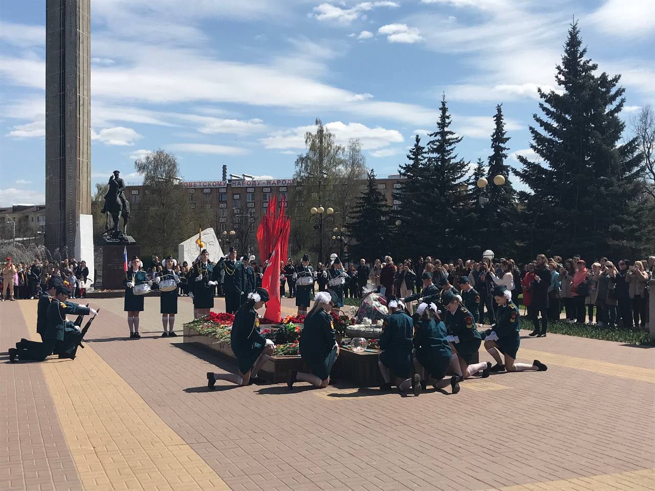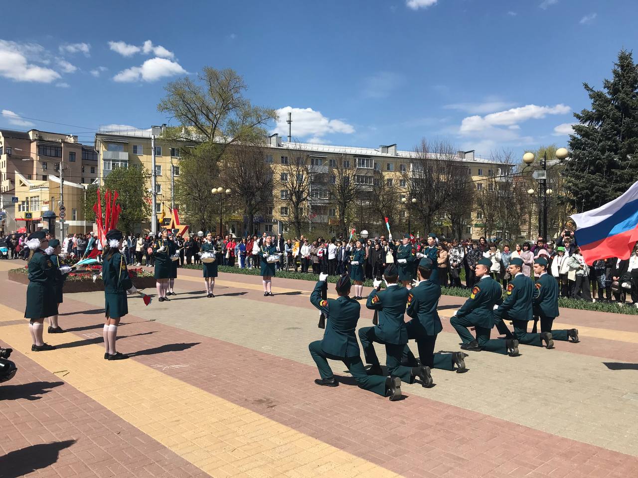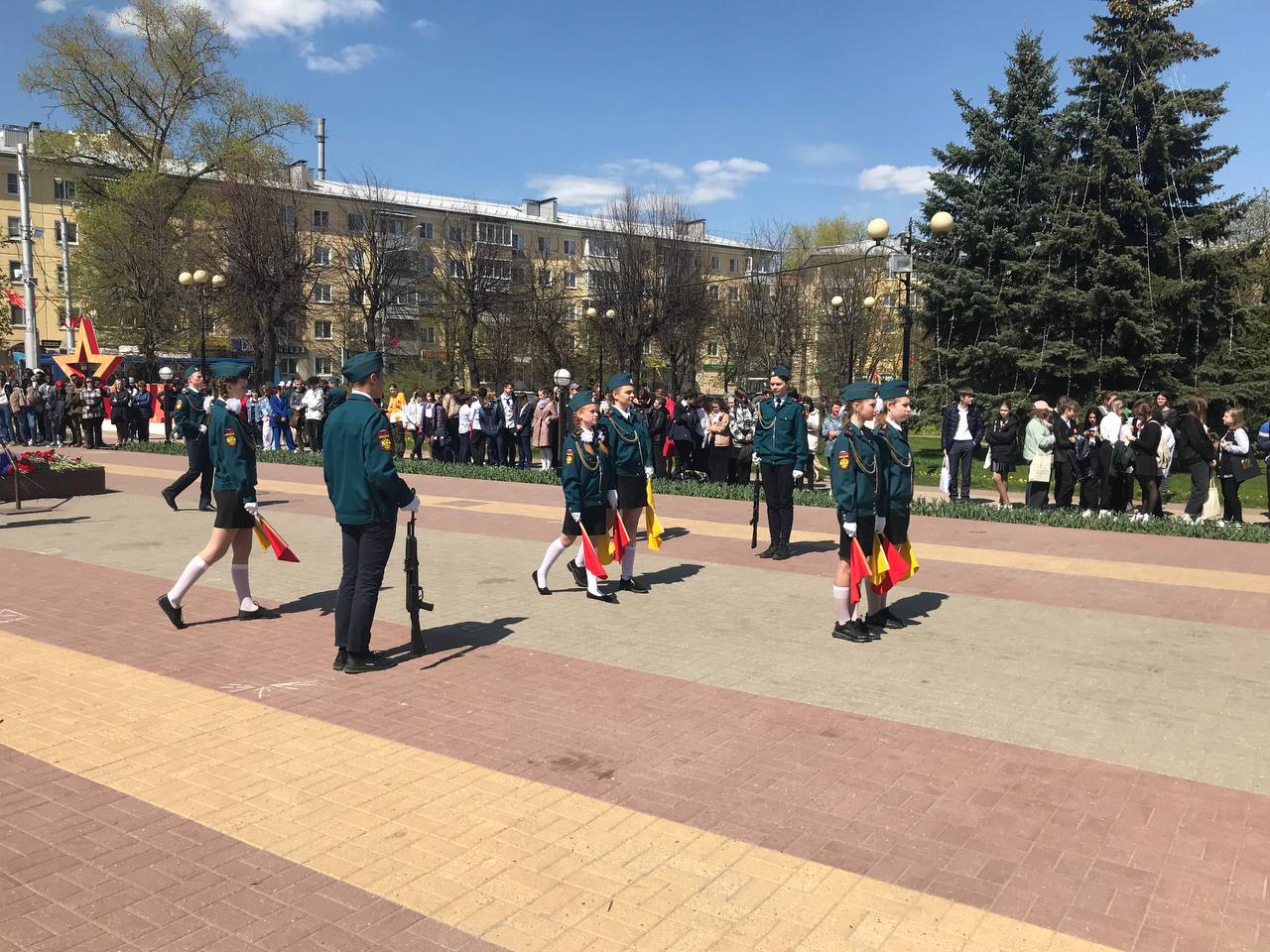 Воинское дефиле отрядов почетных караульных служб началось с выступления коллектива школы №23, который победил в этом году в смотре-конкурсе отрядов Почетной вахты, посвященном 47-й годовщине образования Поста №1. Затем выступили отряды школ №22, 45 и 15, а также коллектив Калужского колледжа народного хозяйства и природообустройства.