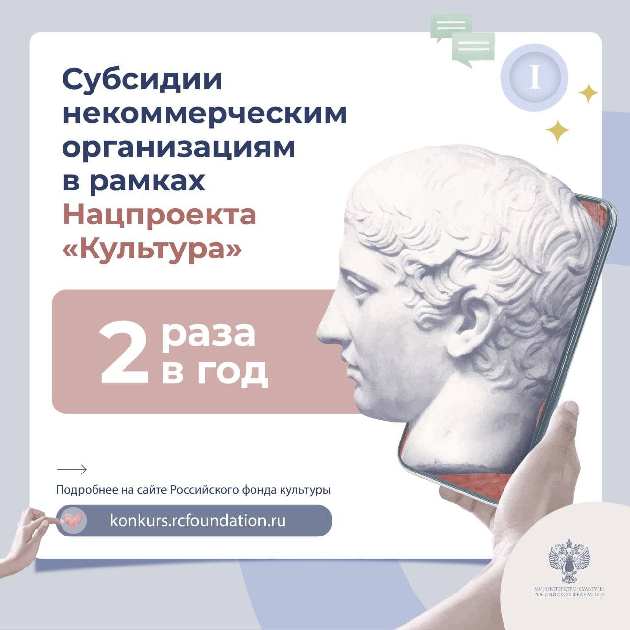 1. Дважды в год в рамках реализации нацпроекта «Культура» проходит конкурс с выделением субсидий НКО. Подробнее сайте Российского фонда культуры (Конкурс).