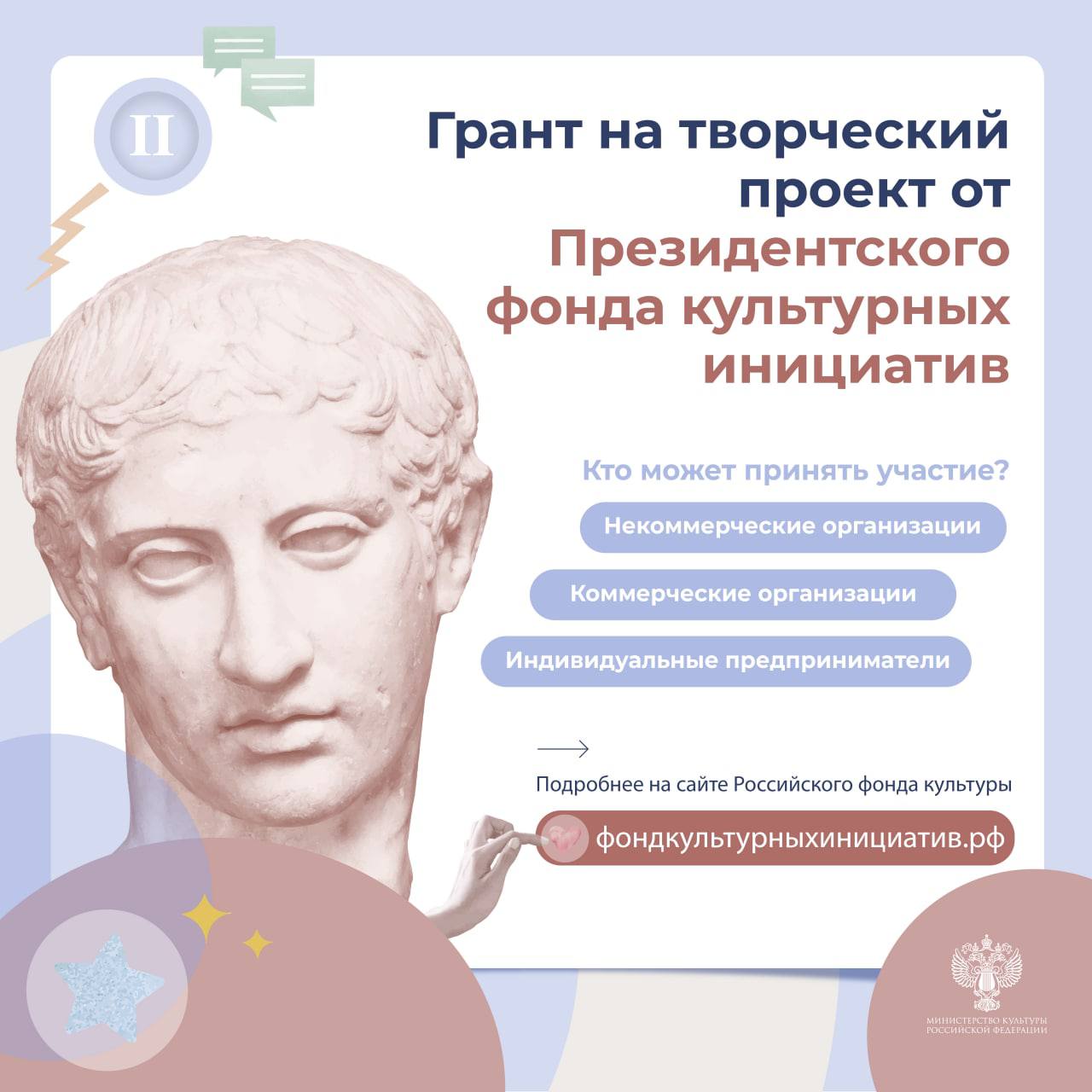 Если вы являетесь физическом лицом или индивидуальным предпринимателем, или представителем коммерческих и некоммерческих организаций, а также творческих союзов и у вас есть интересный проект в сфере культуры и искусства, то специально для вас Министерством культуры России подготовлена памятка о том, как вы можете получить поддержку в реализации ваших проектов.