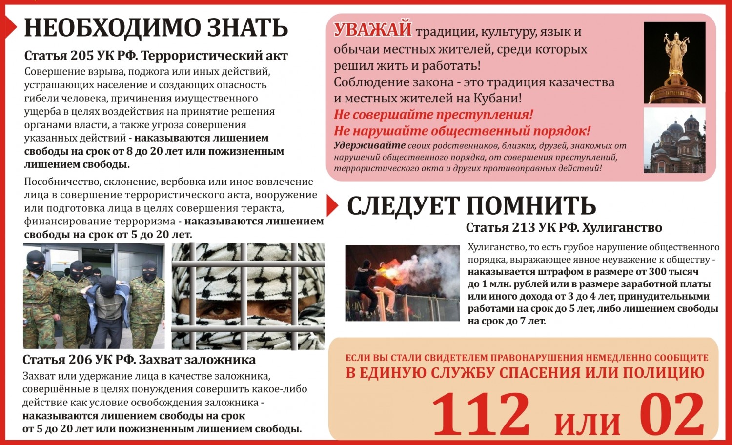 Совершая поездки в транспорте (особенно в метро), обращайте внимание на оставленные предметы (сумки, портфели, свертки и т.д.). При их обнаружении немедленно сообщите сотруднику полиции. Не открывайте подозрительные предметы, не трогайте руками, предупредите стоящих рядом людей. Обычно взрывные устройства закладывают в подвалы, на первых этажах, под лестницей около мусоропровода. Будьте внимательны!