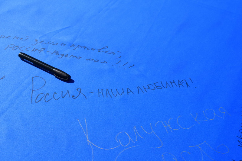 Во флешмобе приняли участие волонтеры и молодежь, юнармейцы, члены Общественной палаты Калужской области. На небольшом фрагменте российского флага активные горожане написали фразы-пожелания, патриотичные слова.