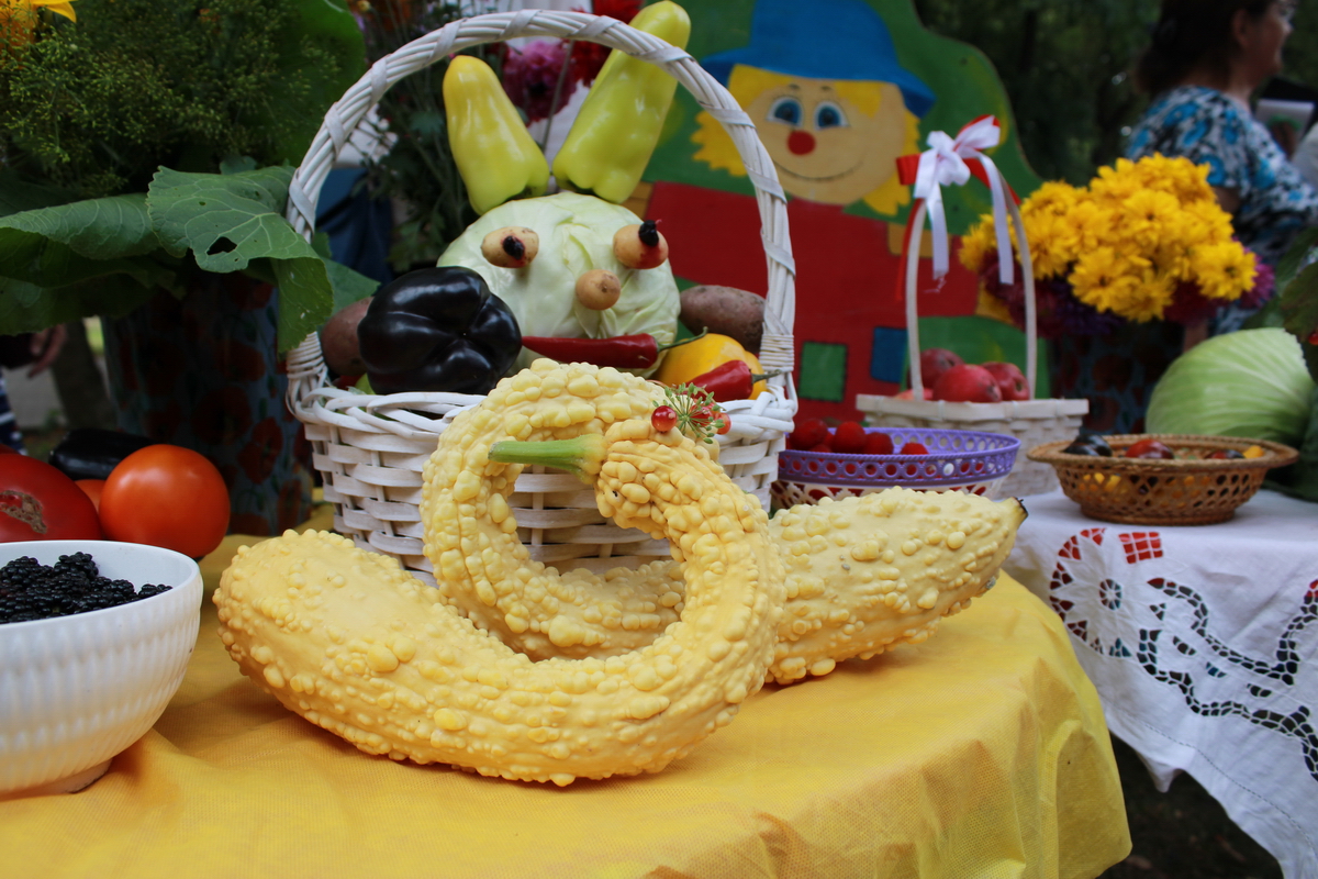 Помимо огурцов, помидоров, тыкв, кабачков, капусты, ягод самых неожиданных форм, цветов и размеров, здесь можно было увидеть и другие, более редкие для средней полосы России дары земли — арбузы, виноград, дыни, алычу.