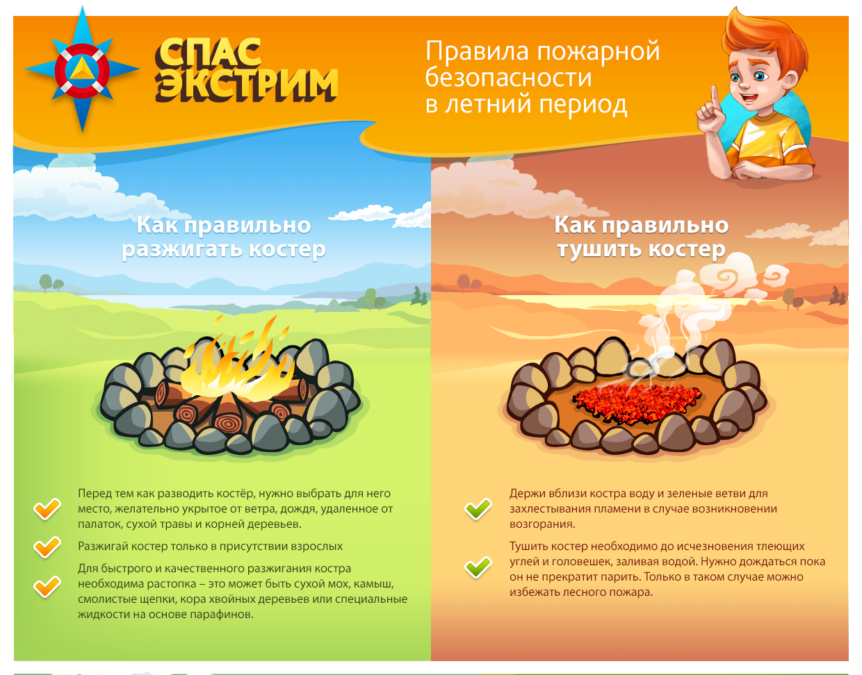 Костер разводить можно только в специально оборудованных местах: вдали от сухих листьев, веток, корней деревьев и молодняка, в месте, очищенном от горючих материалов в радиусе 1,5 м. Если костер больше не нужен, его нужно затушить: тщательно засыпать землёй и залить водой до полного прекращения тления. В сухую и ветреную погоду разведение костров не допускается!