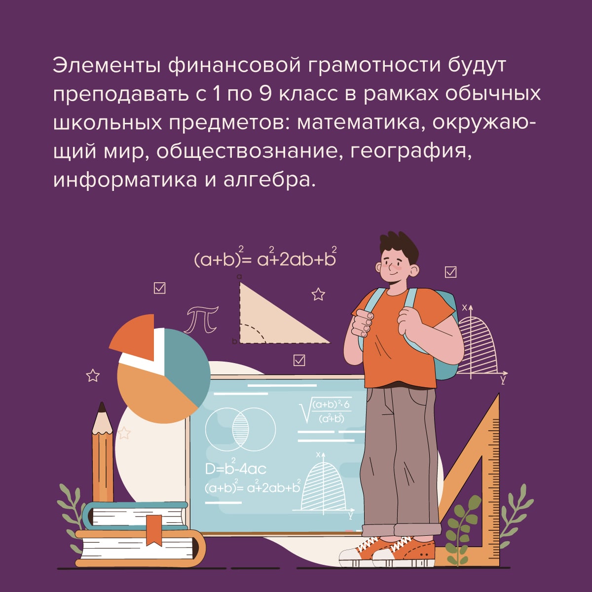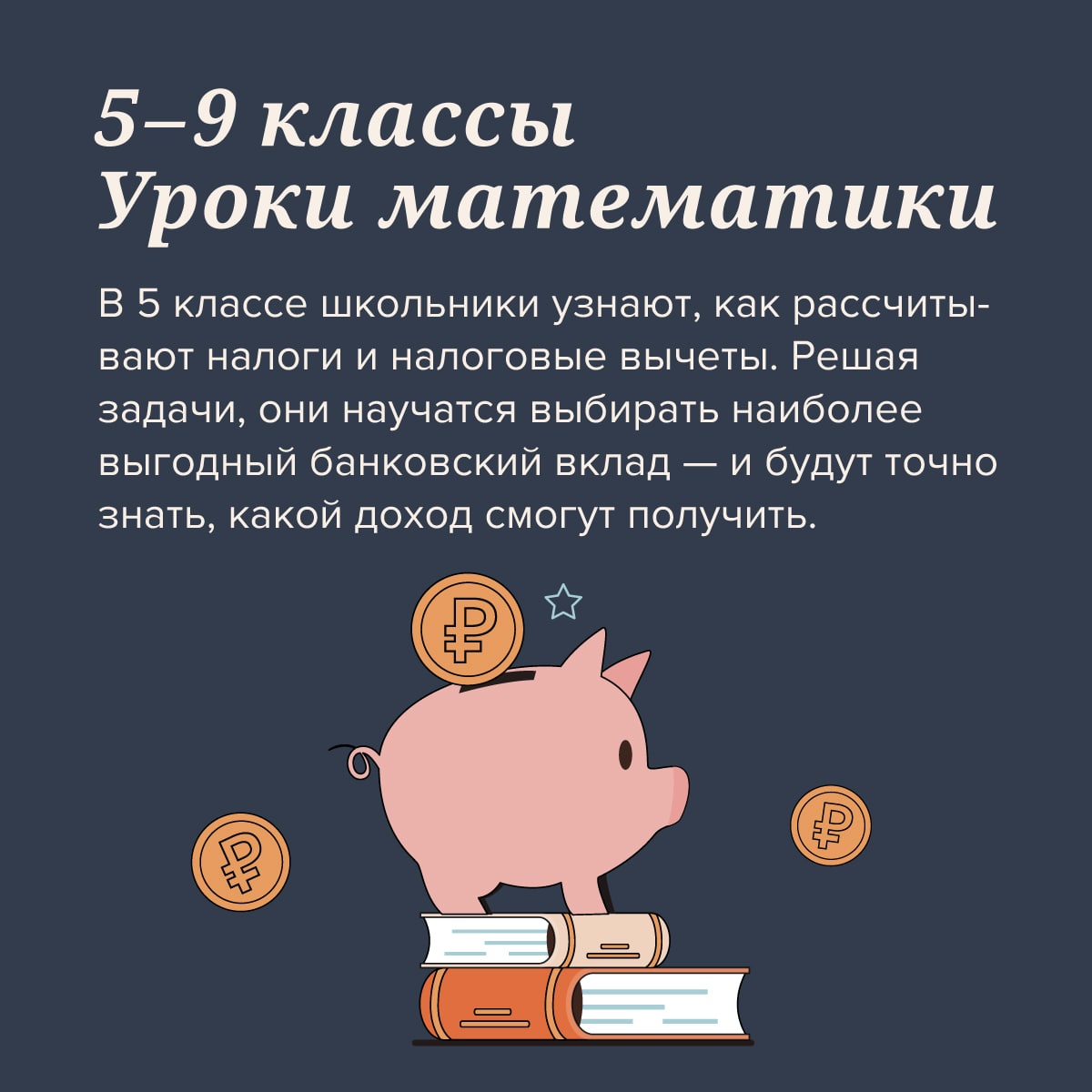 Ученики 5-9 классов будут изучать азы финансовой грамотности на уроках математики, географии, обществознания и информатики. Они узнают, что такое предпринимательство и каковы его риски, как распознавать темные финансовые схемы и мошенников, научатся рассчитывать налоги, стоимость товаров и не только. Например, с 14 лет начинается новый этап жизни подростка – получение паспорта, на законодательном уровне появляется возможность открывать вклады в банках. И здесь пригодится важный элемент школьного обучения – умение составлять те или иные финансовые документы: декларации, договоры. В том числе в электронном виде.