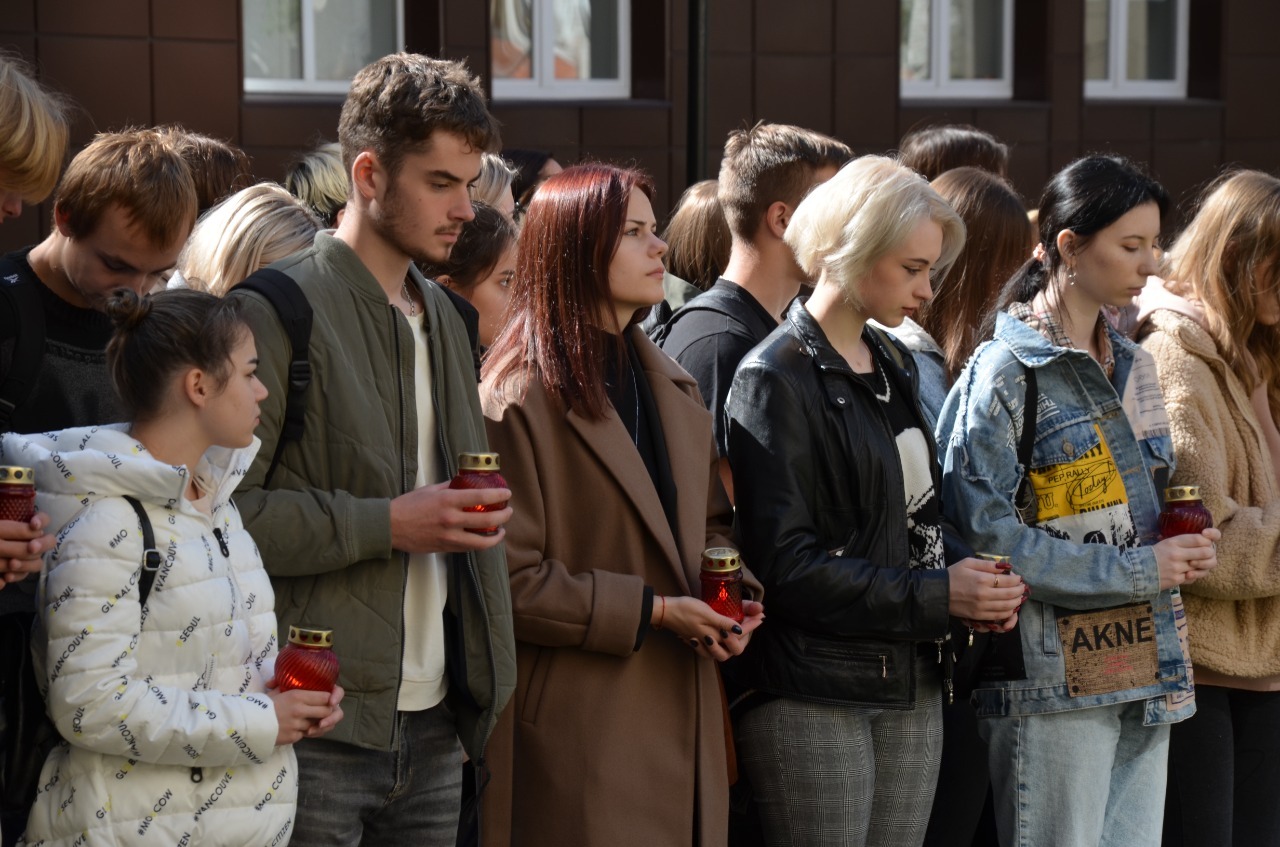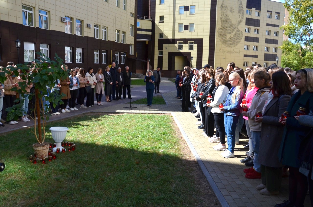 Во внутреннем сквере вуза юноши и девушки почтили память жертв терактов минутой молчания, символично «напоили» деревья водой из рук, сложенных лодочкой, а также установили на дорожках сквера зажженные лампадки.