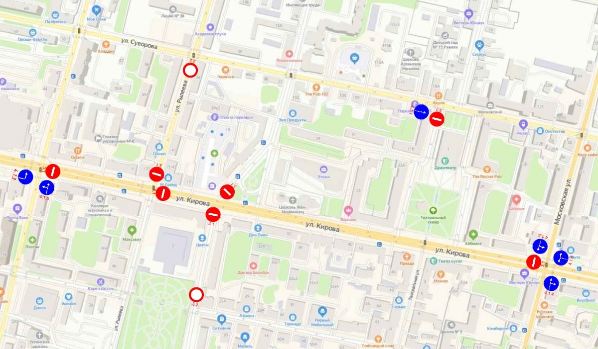 Пассажирский транспорт будет осуществлять движение в объезд закрываемого участка по улицам Огарева, Рылеева, Суворова, Большевиков в сторону пл Мира, по улицам Плеханова, Суворова, Ленина в сторону пл.Победы.