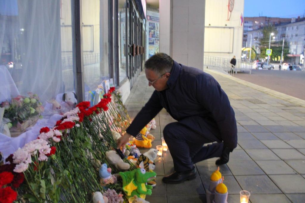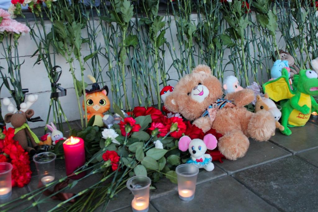 К кинотеатру «Центральный» люди несут цветы, свечи и детские игрушки. Их оставляют прямо на ступенях, у входа, где и образовался своеобразный мемориал в знак солидарности с жителями Ижевска, где сегодня произошла трагедия. Также спонтанный мемориал образован в сквере Матери на Правобережье.