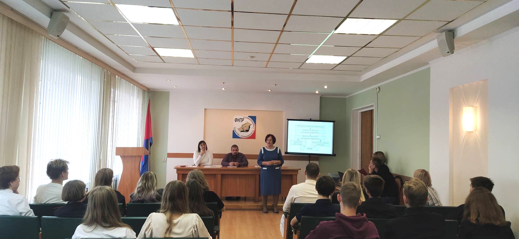 Заместитель председателя Калужского областного совета профсоюзов Александра Кривошеина, председатель молодежного совета Калужского облсовпрофа Александр Симаков и его коллега Анастасия Крючкова провели для школьников профсоюзный урок.