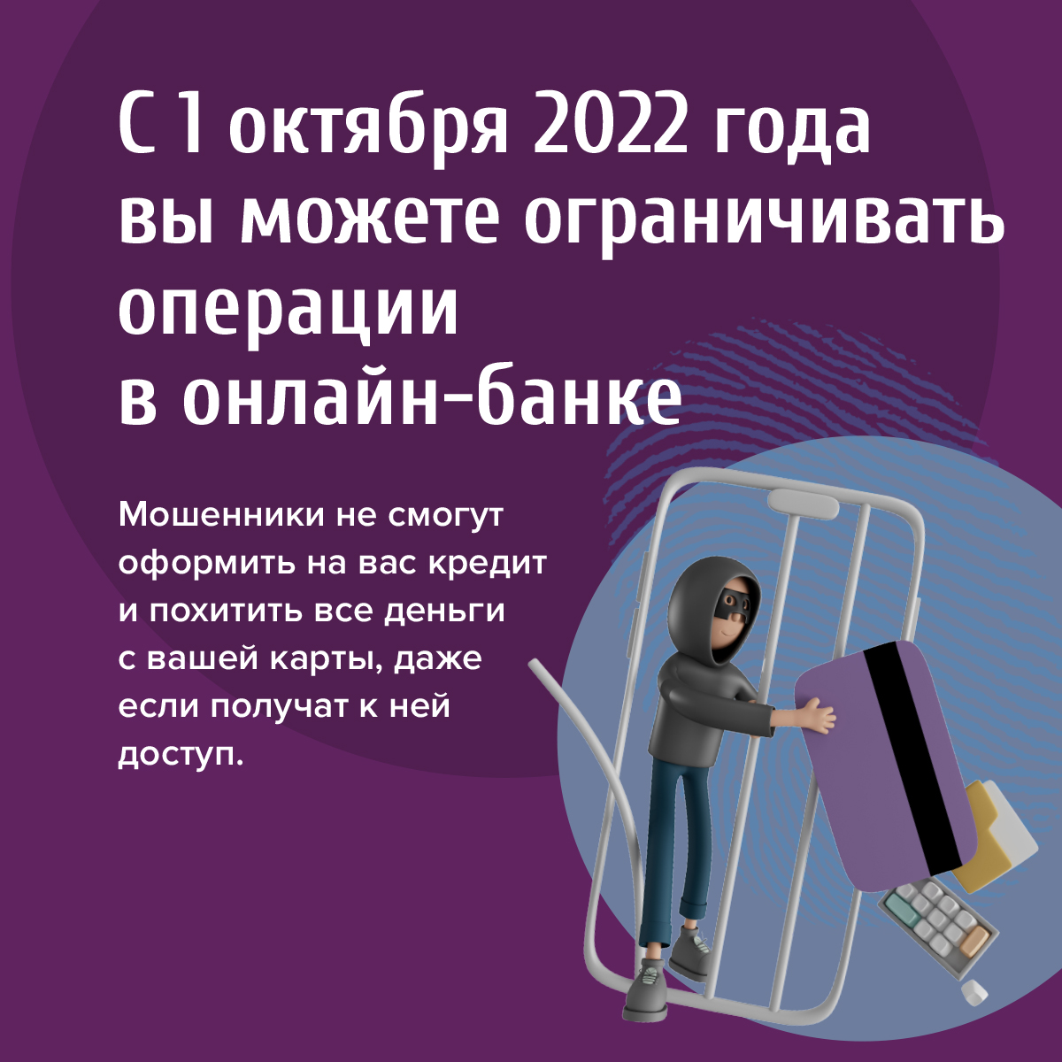 С 1 октября 2022 года клиенты смогут самостоятельно устанавливать в банке, в котором они обслуживаются, запрет на онлайн-операции, включая онлайн-кредиты. Кроме того, клиенты банков смогут ограничивать параметры онлайн-операций — максимальную сумму для одной транзакции или лимит на определенный период времени.