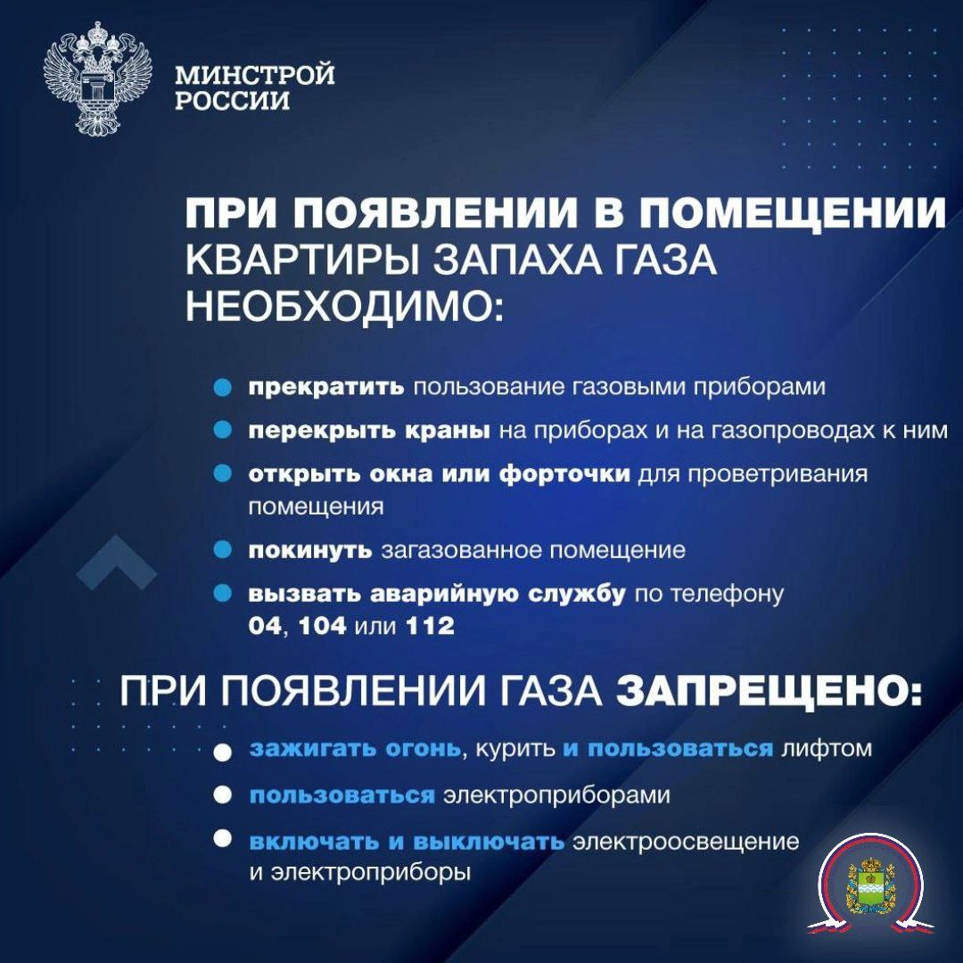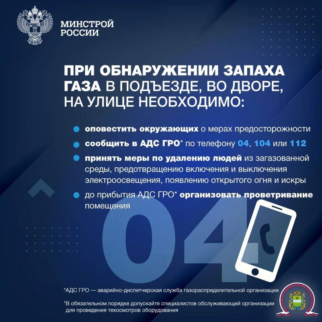 Будьте осторожны с бытовым газом, выполняйте все требования по безопасной эксплуатации газовых приборов. При возникновении аварийной ситуации, обнаружении запаха газа, необходимо перекрыть краны на газовых приборах и перед ними, устранить источники открытого огня, организовать проветривание помещения, незамедлительно обратиться в аварийно-диспетчерскую службу АО «Газпром газораспределение Калуга» вне загазованного помещения по телефону: