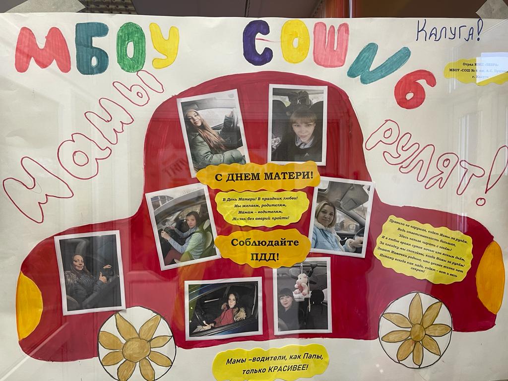 Помощники автоинспекторов из МБОУ «СОШ №6 г. Калуги» изготовили тематический плакат, поздравили женщин-водителей и вручили им памятки о безопасном поведении на дорогах и правилах перевозки детей.