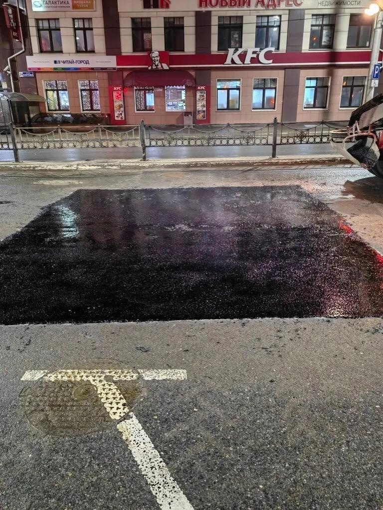 В связи с этим автомобилистов попросили обращать внимание на сигнальные дорожные конусы, поскольку литой асфальтобетонной смеси необходимо 20-30 минут для застывания.