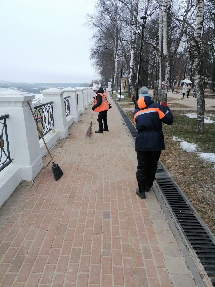 Рабочие убирают наледь с тротуаров, обрабатывают автодороги и скользкие места, вывозят снег, подметают пешеходные дорожки, убирают мусор как на улицах города, так и в местах отдыха и прогулок калужан – в парках и скверах.