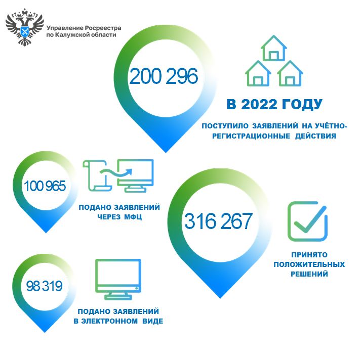 В 2022 году в Управление Росреестра по Калужской области подано почти 200 296 пакетов документов о государственном кадастровом учете (ГКУ) и (или) государственной регистрации прав (ГРП) на недвижимое имущество, что на 22,3% меньше, чем в 2021 году. Из них через МФЦ подано порядка 100 965 заявлений, уменьшение по сравнению с предыдущим годом составило 22,6%.