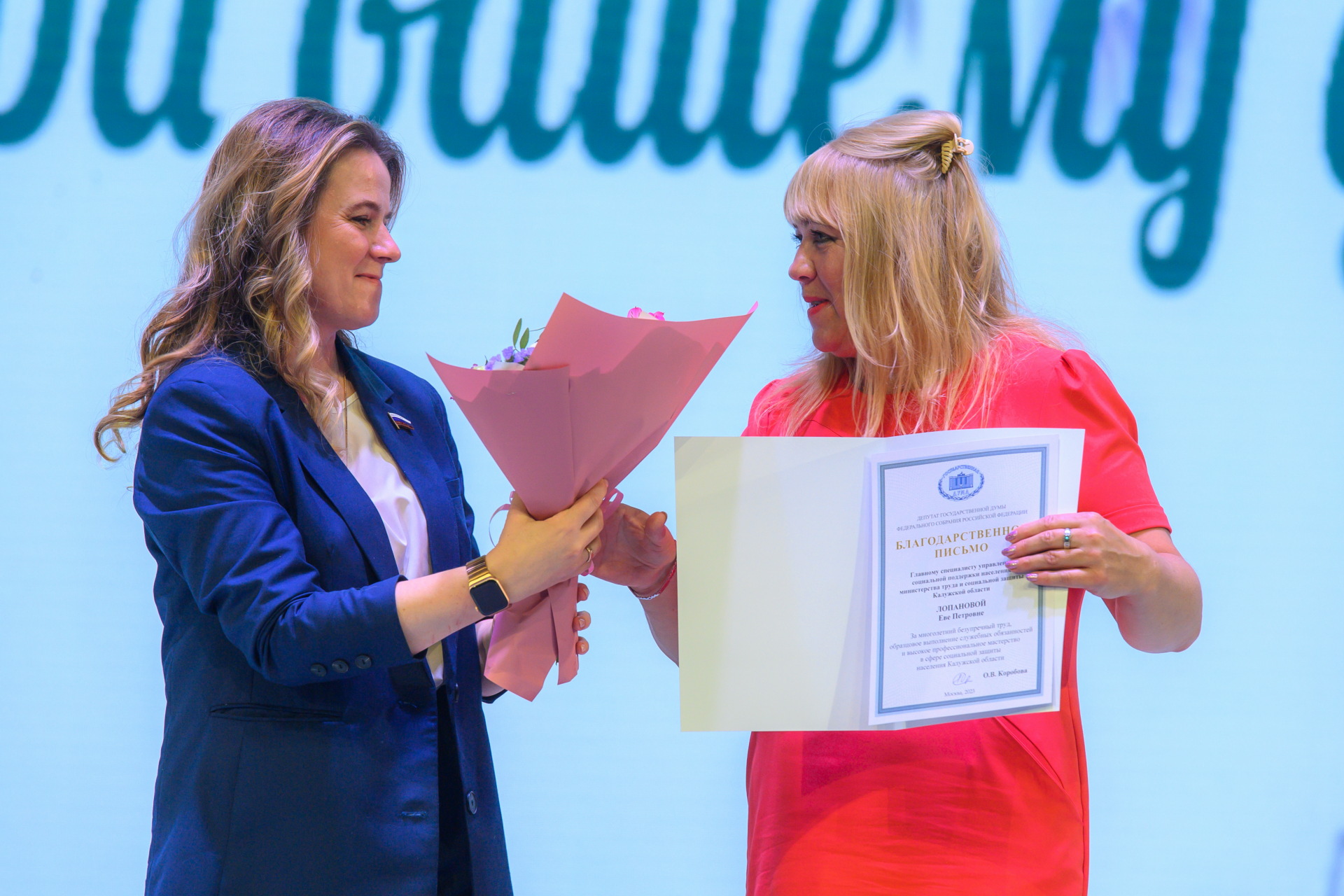 Теплые слова и благодарность за труд прозвучали в адрес социальных работников и сотрудников службы занятости от депутата Государственной Думы Федерального Собрания Российской Федерации Ольги Коробовой, заместителя Председателя Законодательного Собрания региона Александра Ефремова, уполномоченного по правам ребенка в Калужской области Ирины Агеевой, председателя Общественной палаты Калужской области Оксаны Миловановой.