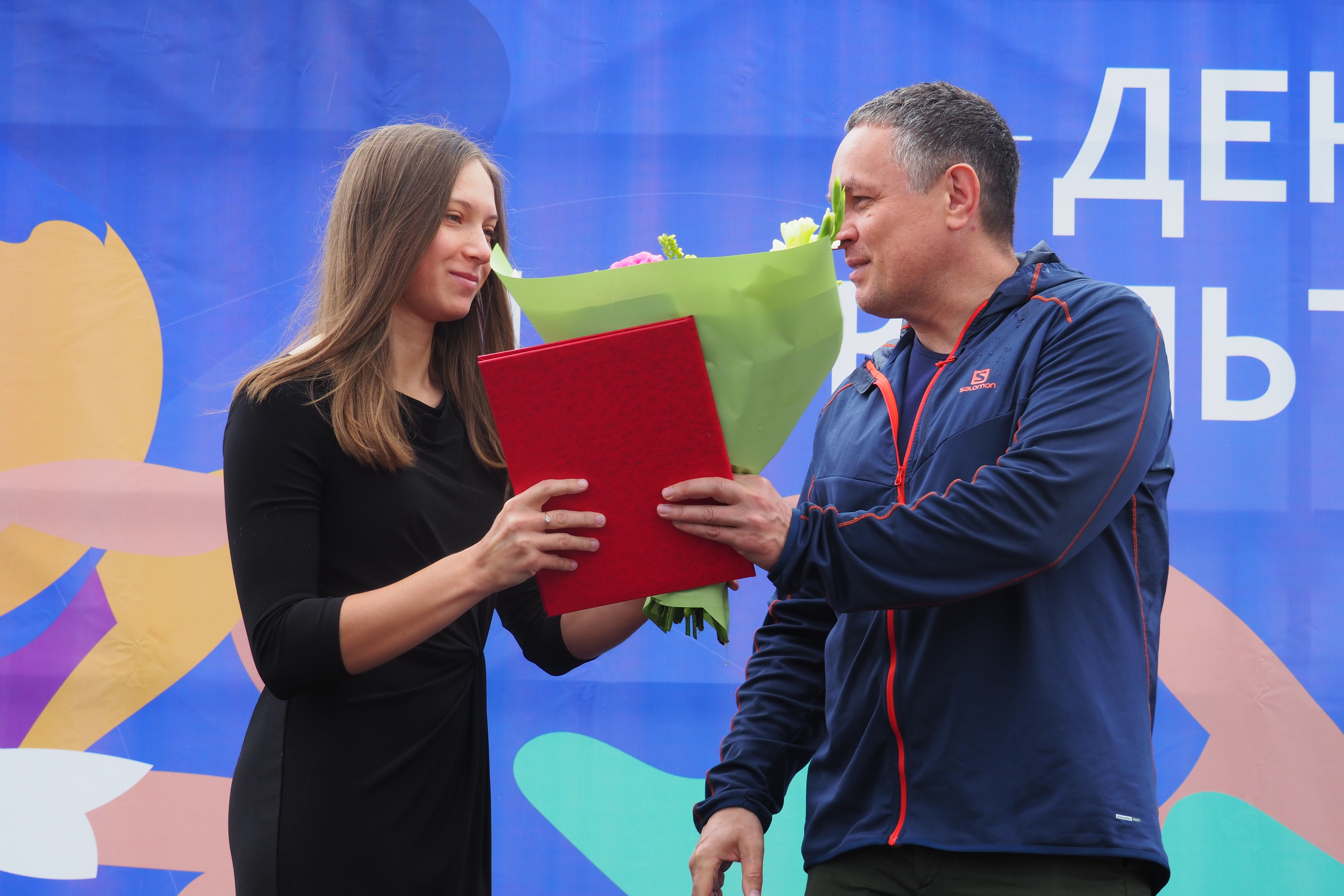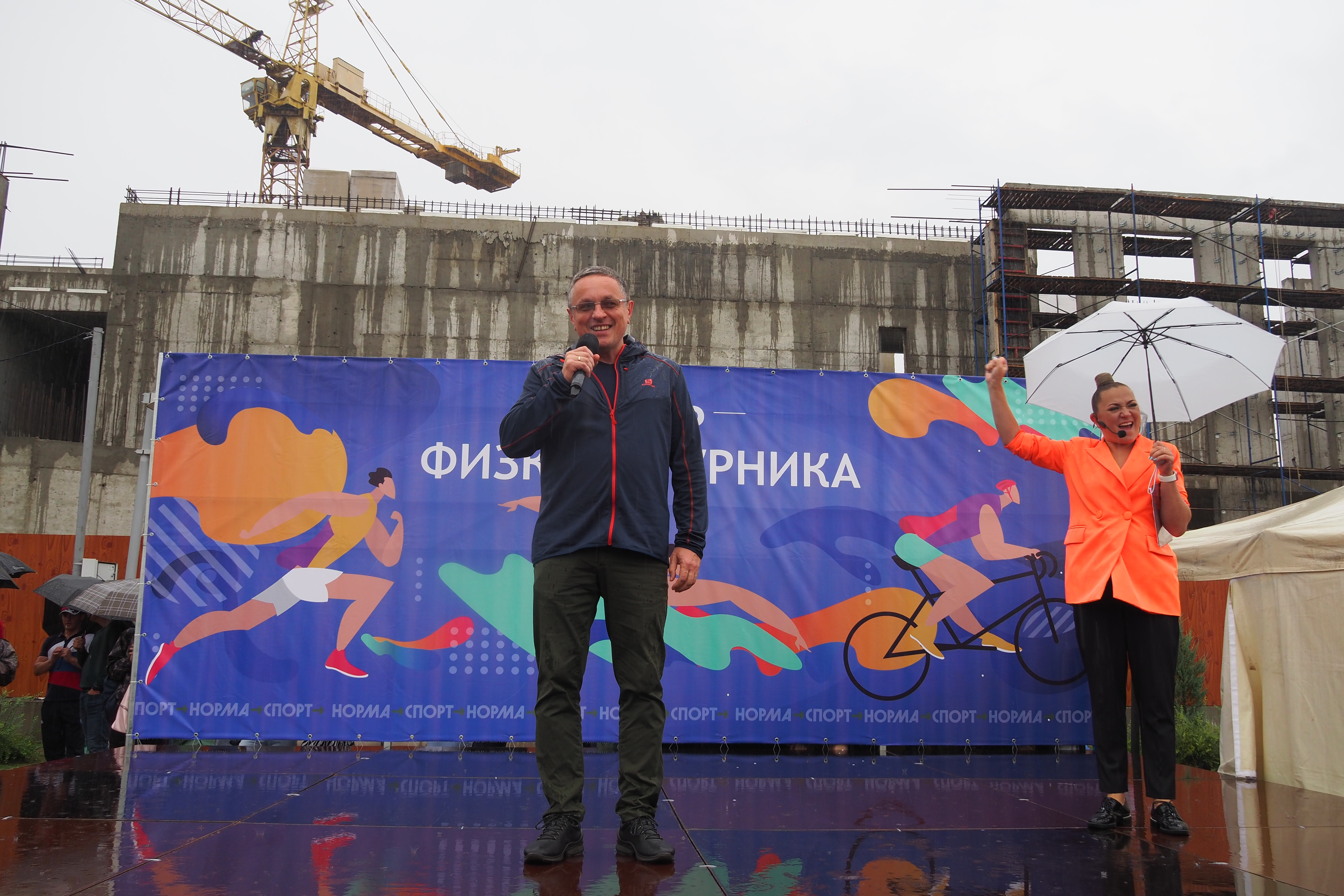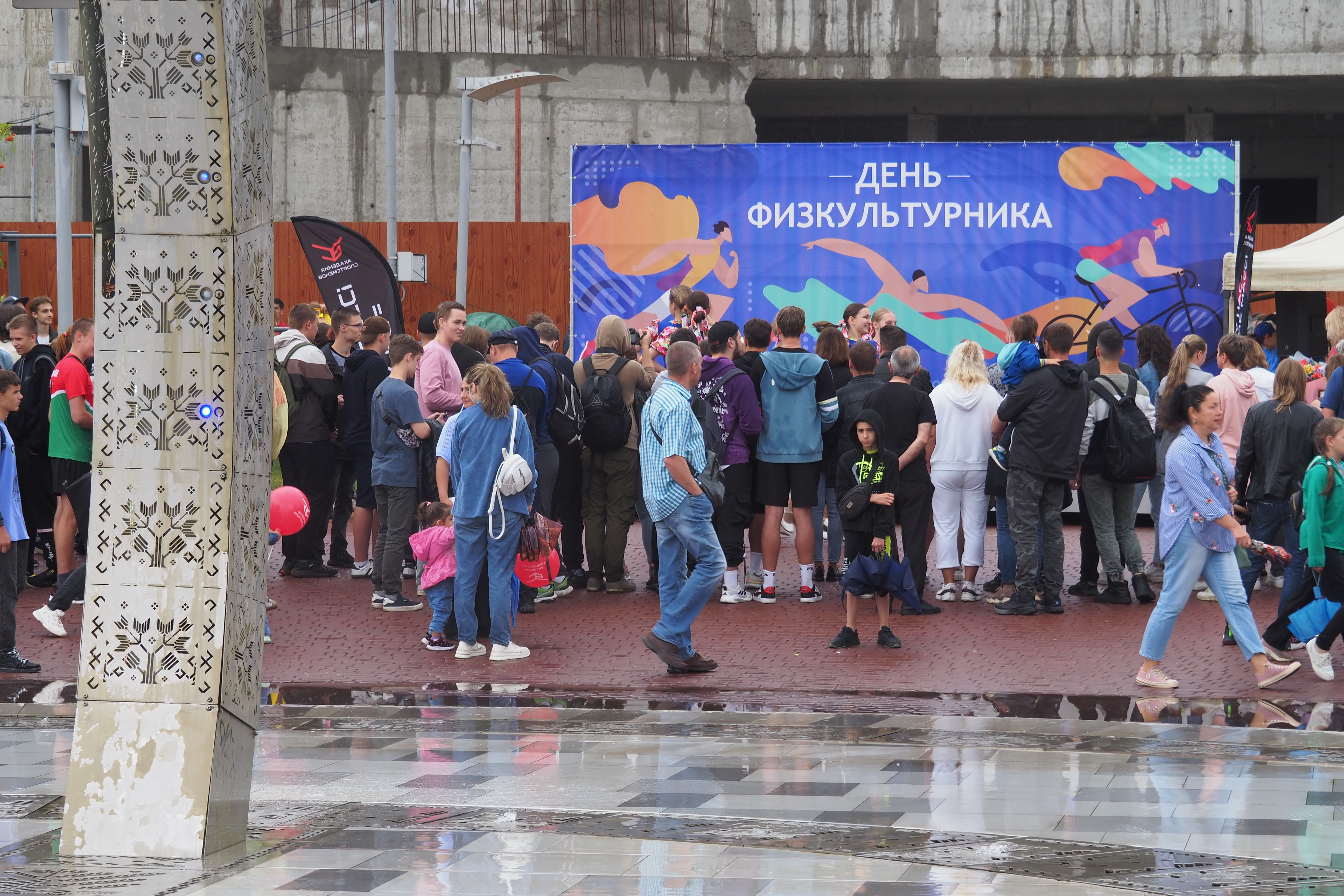 Торжественное мероприятие, посвященное празднованию Дня физкультурника, состоялось в парке Театра юного зрителя несмотря на непогоду.