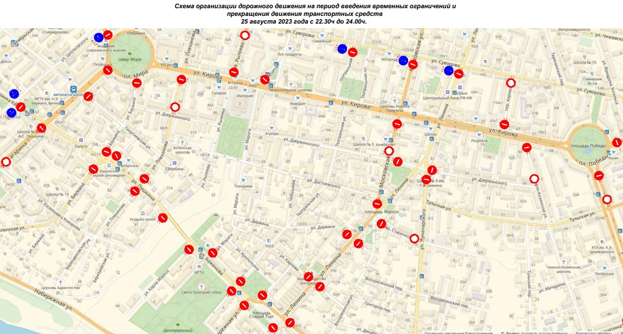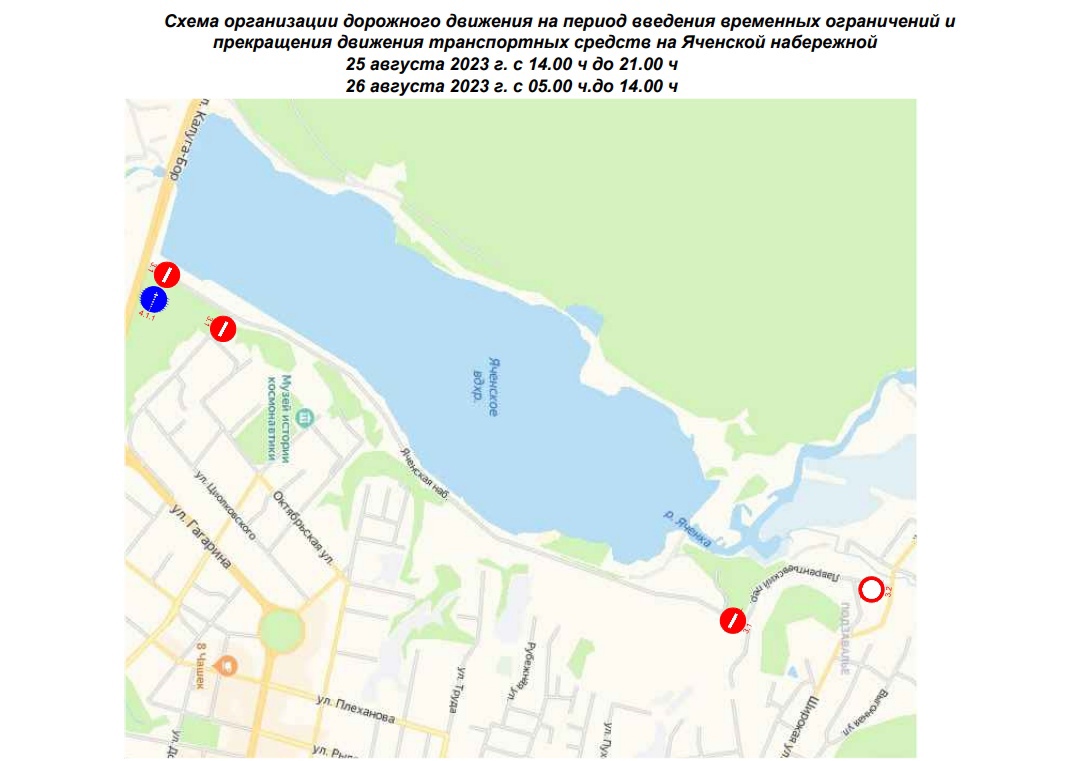 В День города и накануне праздника в Калуге будут введены ограничения для транспорта. Согласно постановлению, подписанному городским головой Калуги Дмитрием Денисовым, 25 августа с 14.00 до 21.00 будет перекрыт участок набережной Яченского водохранилища от улицы Калуга-Бор до Лаврентьевского переулка. Ограничения вводятся на время проведения «Космического марафона» — с участием детей и людей с ограниченными возможностями.