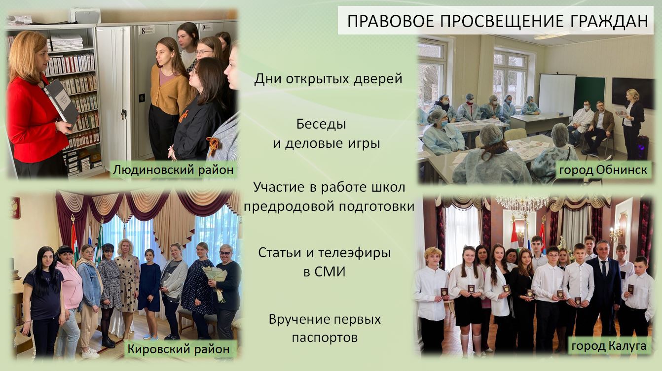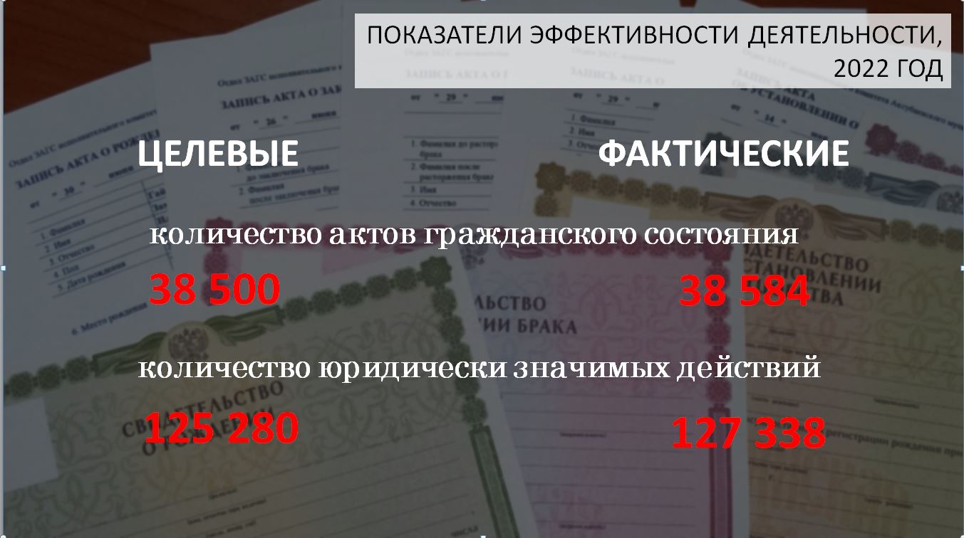 По данным и.о. начальника управления записи актов гражданского состояния Калужской области Юлии Гусевой, ежегодно в органах ЗАГС Калужской области регистрируют около 40 тысяч актов гражданского состояния, совершают более 127 тысяч иных юридически значимых действий. Целевые показатели эффективности деятельности органов государственной власти, установленные Минюстом России, в Калужской области выполняются.