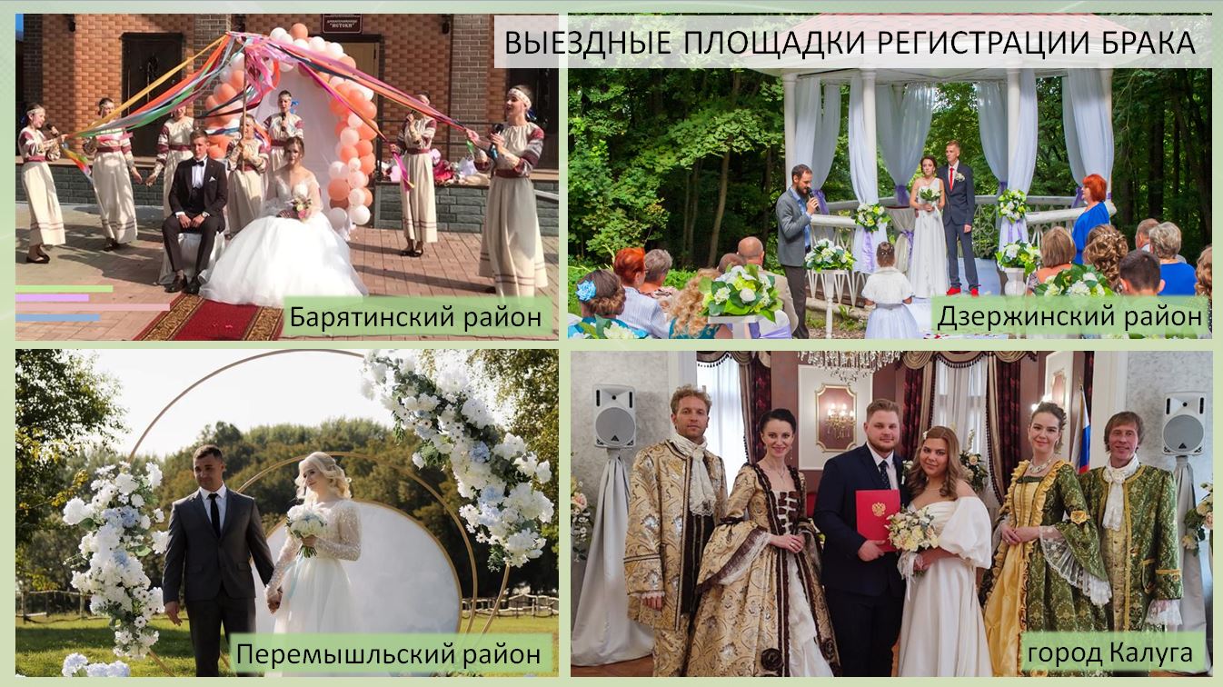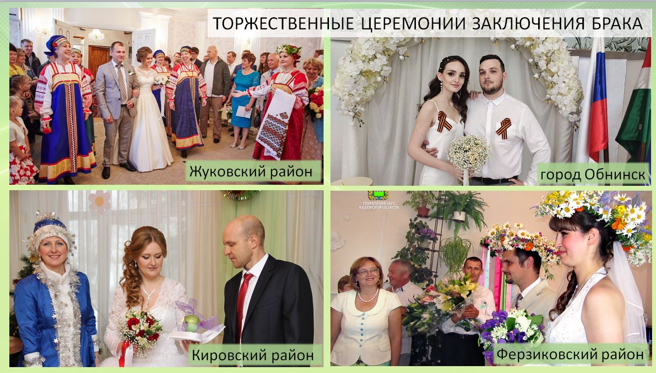 Большое внимание уделяется проведению торжественных церемоний регистрации заключения брака. Ежегодно в органах ЗАГС Калужской области регистрируется около 7 тысяч браков. Большинство выбирают торжественную форму регистрации. С 2008 года проходит смотр-конкурс «Лучший ведущий торжественной церемонии бракосочетания».