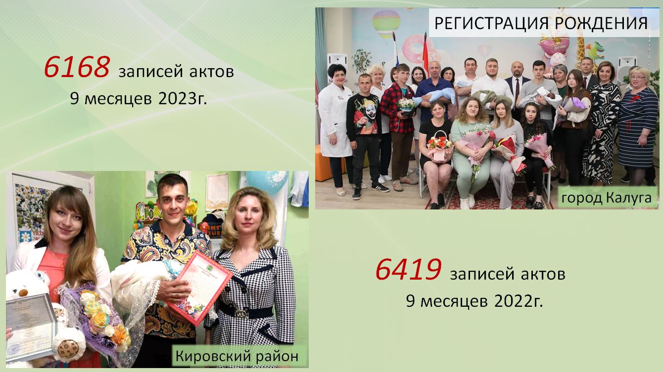 За 9 месяцев текущего года зарегистрировано 6168 актов о рождении. Чтобы придать особую атмосферу этому событию, сотрудниками ЗАГС проводятся торжественные выписки новорожденных в помещении роддома, проходят праздники имянаречения, вручаются Благодарственные письма Губернатора Калужской области.