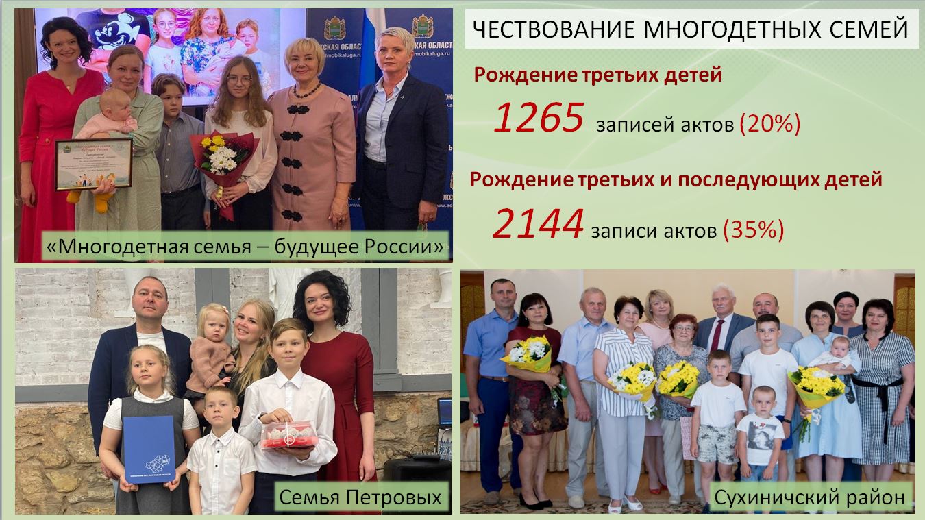 С начала этого года 1265 калужских семей стали многодетными. Управлением ЗАГС области совместно с Калужским региональным отделением Союз женщин России и при поддержке министерства труда и социальной защиты Калужской области проводится акция «Многодетная семья – будущее России».