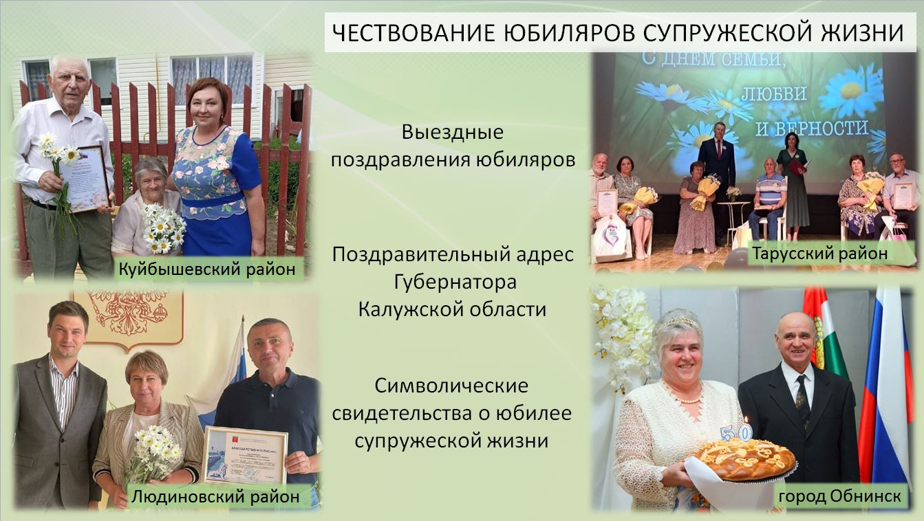 Супругам, начиная с 50-ти лет совместной жизни, традиционно вручается специальный поздравительный адрес Губернатора области. По инициативе сотрудников органов ЗАГС изготовлены символические свидетельства о юбилее семейного союза, ведутся юбилейные книги записей актов о браке.