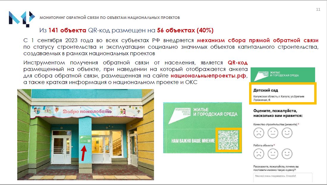 Дмитрий Разумовский также сообщил, что с июля 2023 года информация об социально значимых объектах, которые были созданы в рамках национальных проектов, размещается на Геопортале Калужской области (https://geoportal40.ru/). С 1 сентября по поручению Аппарата Правительства Российской Федерации внедряется механизм сбора прямой обратной связи от населения по статусу строительства и эксплуатации данных объектов. На них размещен специальный QR-код с анкетой на сайте национальныепроекты.рф. С помощью нового механизма пока в регионе можно оценить 56 объектов.