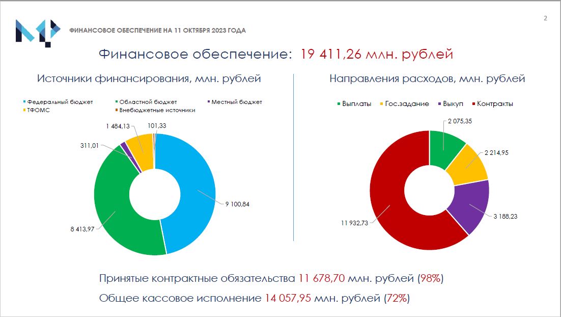 По информации заместителя губернатора Дмитрия Разумовского, на 1 октября 2023 года законтрактовано почти 11,7 млрд рублей, общее кассовое исполнение составило свыше 14 млрд рублей. Из 160 показателей, предусмотренных паспортами региональных проектов, достигнуто 98, из 182 результатов – 90.