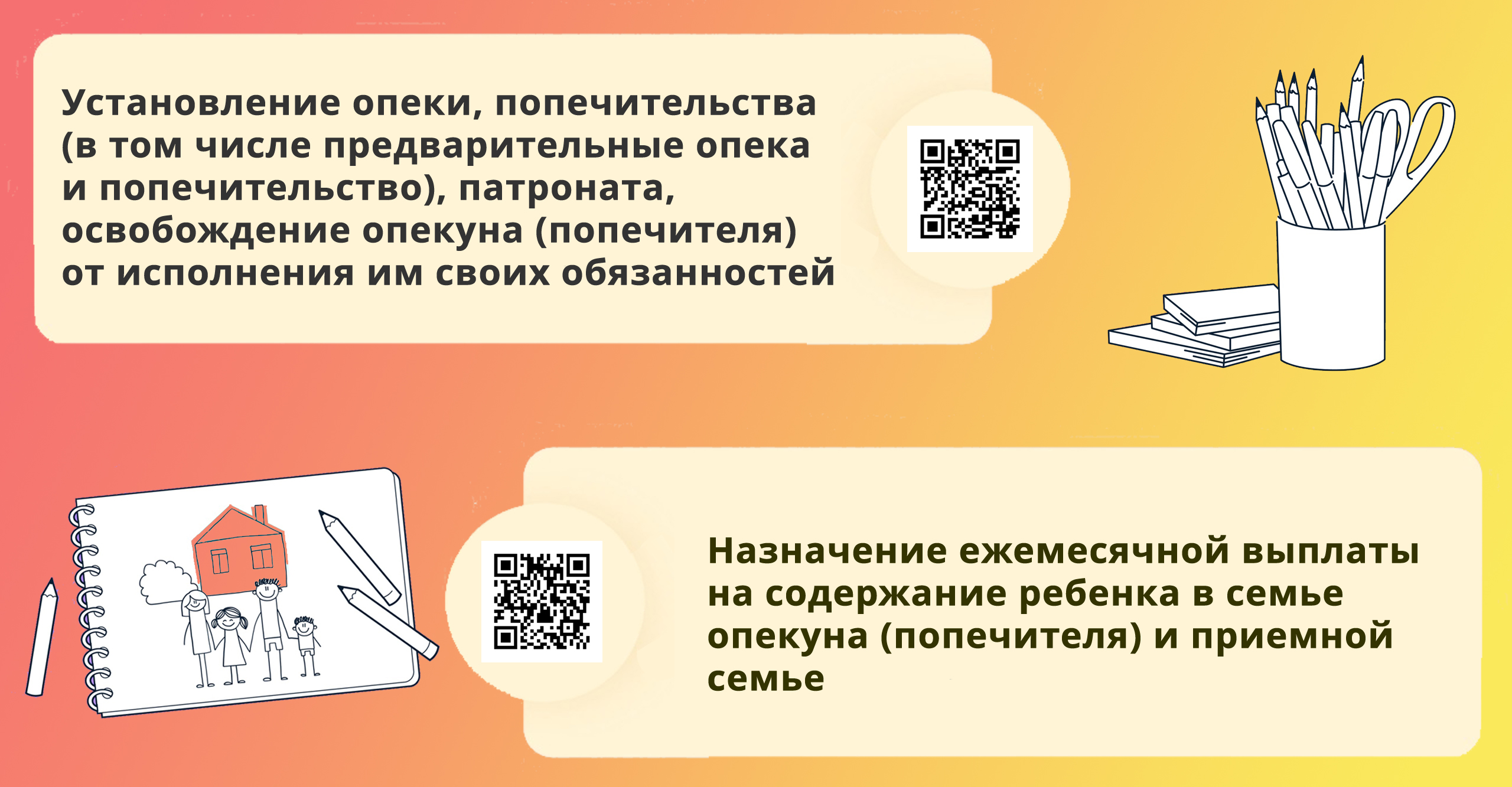 установление опеки, попечительства (в том числе предварительные опека и попечительство), патроната, освобождение опекуна (попечителя) от исполнения им своих обязанностей - https://www.gosuslugi.ru/600235/1/form