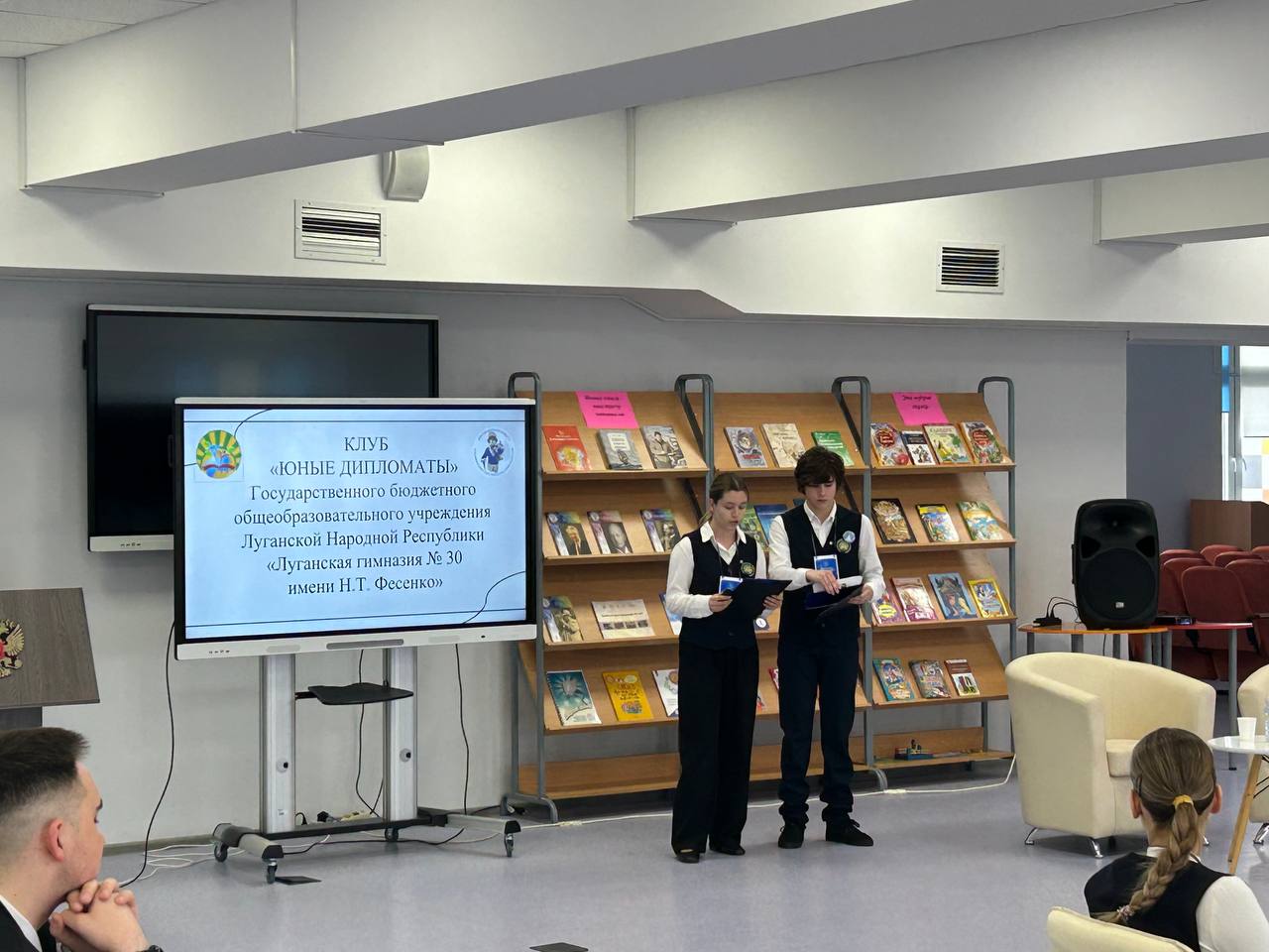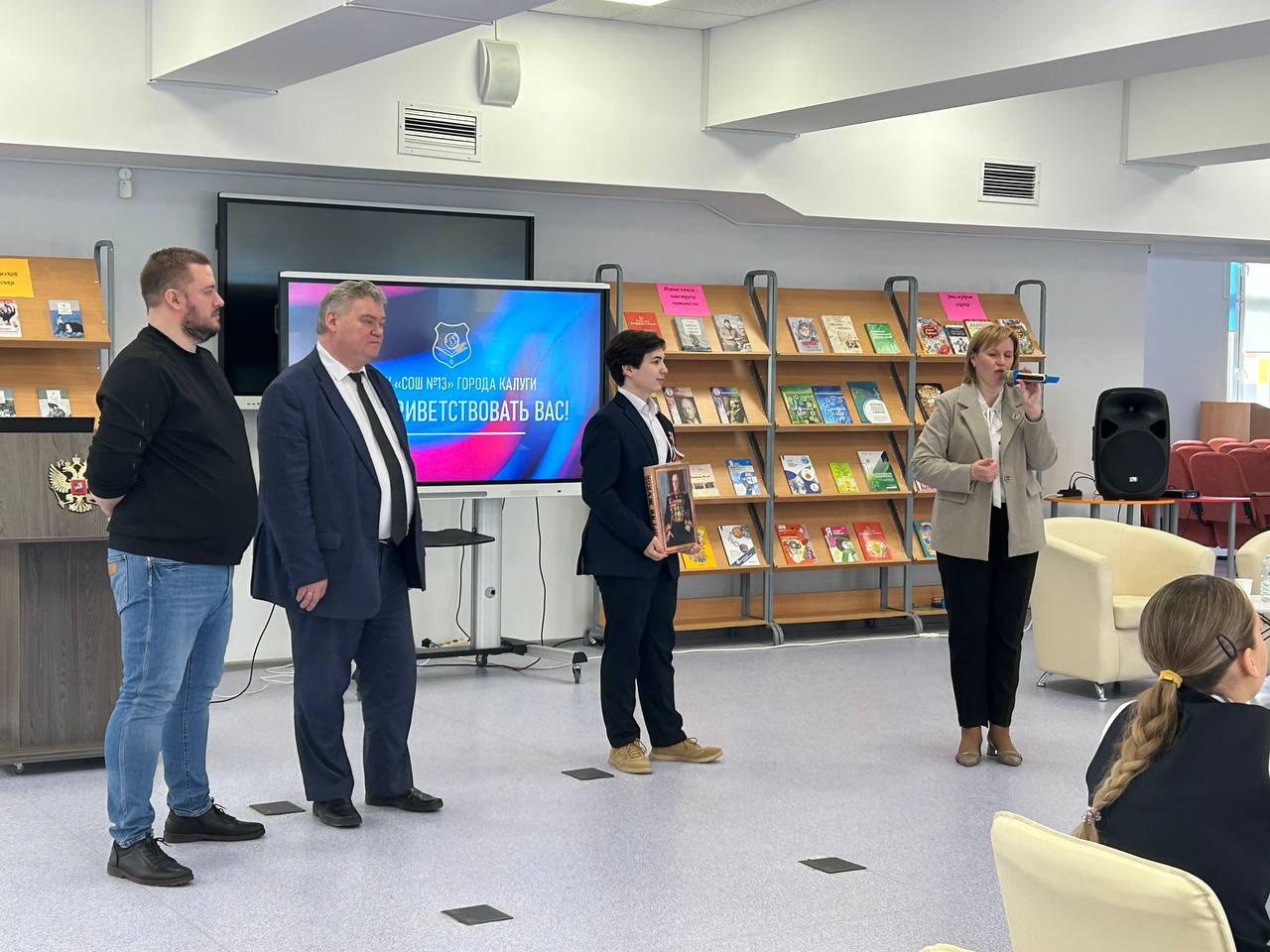 Визит гостей начался со встречи с известным российским дипломатом Борисом Медведевым и министром внутренней политики Калужской области Олегом Калугиным на базе школы №13, где в феврале этого года открылся свой "Клуб юных дипломатов".