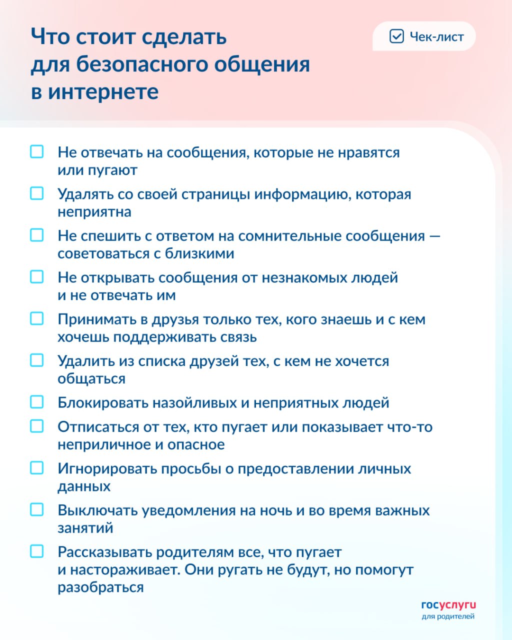 Обидные сообщения в соцсетях часто пишут даже незнакомцы. Иногда конфликты случаются с одноклассниками или приятелями в чатах и сообществах. Отправьте ребенку чек-лист с правилами безопасного общения.