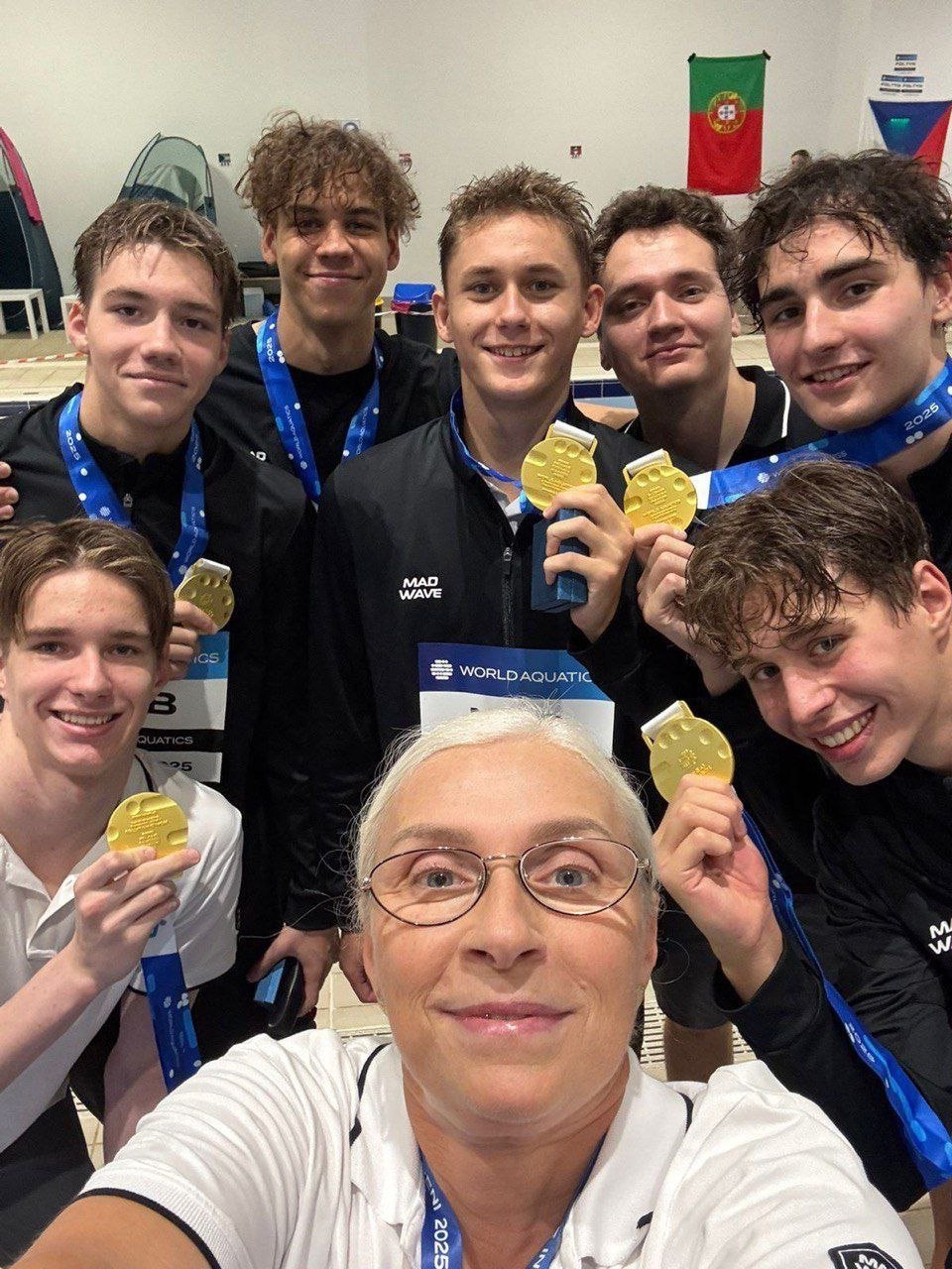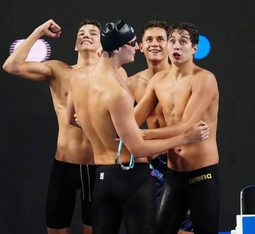 Также наша юношеская эстафета 4х100 метров вольным стилем установила новый мировой рекорд и рекорд молодёжных чемпионатов мира – 3:15.38, обогнав призёров – итальянцев (3:16.03) и американцев (3:17.06).
