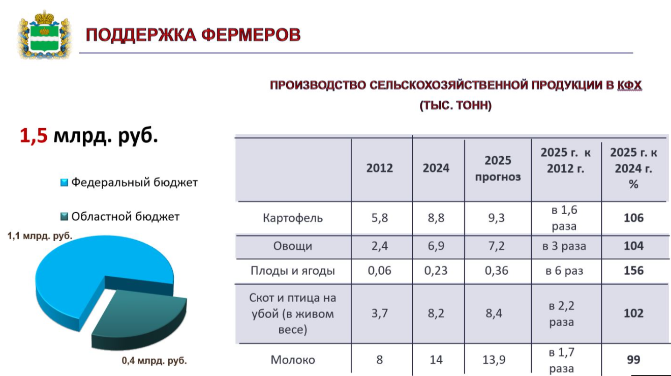 С 2026 года стартует федеральный проект "Развитие малого агробизнеса". С его помощью планируется обеспечить рост производства продукции в фермерских хозяйствах к 2030 году по сравнению с 2024 годом: картофеля вдвое (до 17 тыс. т), овощей в 1,7 раза (до 12 тыс. т), плодов и ягод в 3,8 раза (до 1000 т), рыбы на 25 % (до 425 тонн).