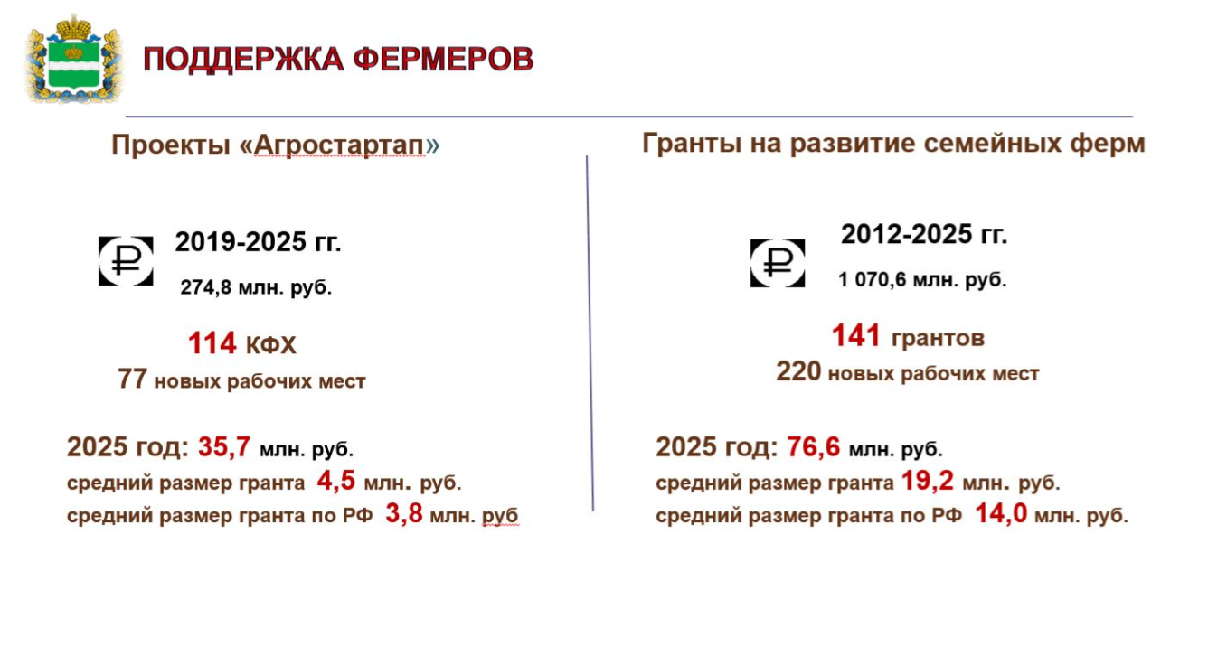 Основной вид поддержки фермеров – гранты. Самый востребованный "Агростартап". С 2019 его получили 114 начинающих предпринимателей. Общая сумма господдержки составила около 275 млн руб. В 2025 году грантополучателями стали 8 фермеров. Средний размер гранта составил 4,5 млн. рублей. Направления проектов - мясное скотоводство,садоводство, овцеводство, картофелеводство и выращивание фундука.