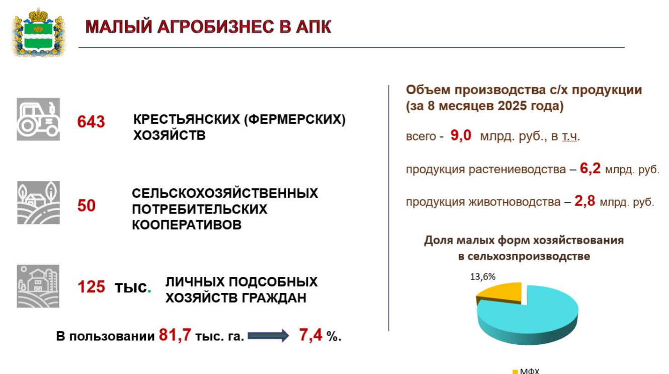 По данным регионального минсельхоза, данный сектор экономики включает 643 крестьянско-фермерских хозяйства, 50 сельскохозяйственных потребкооперативов, 125тыс. личных подсобных хозяйств. С января по август текущего года ими произведено 13,6% от общего объема сельхозпродукции области.