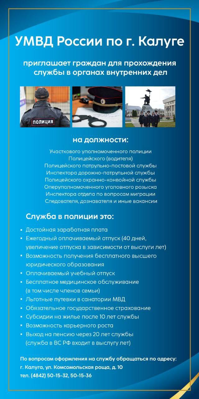 УМВД России по городу Калуге приглашает граждан для прохождения службы в органах внутренних дел на должности:
