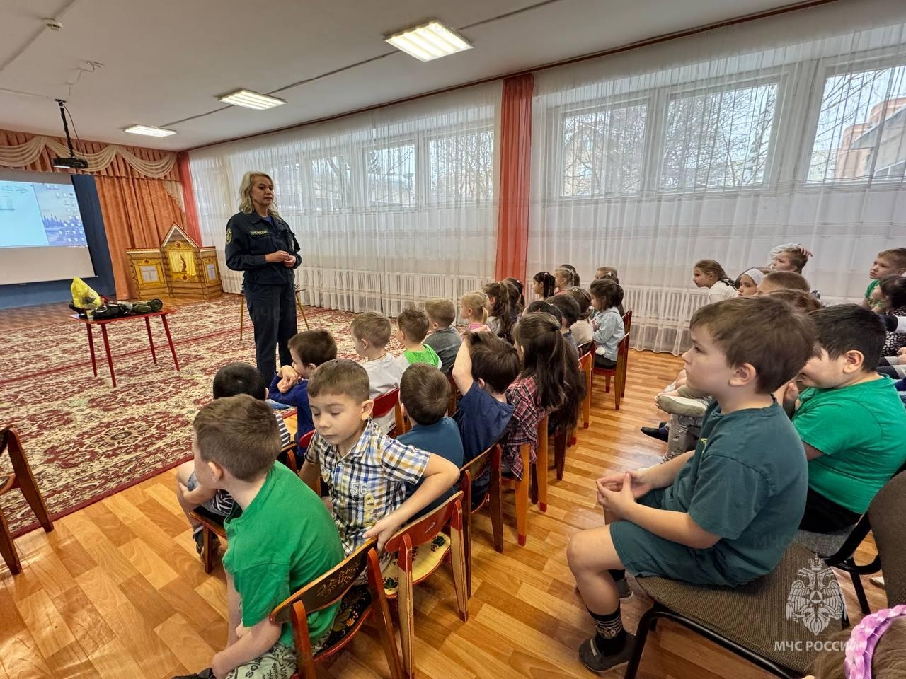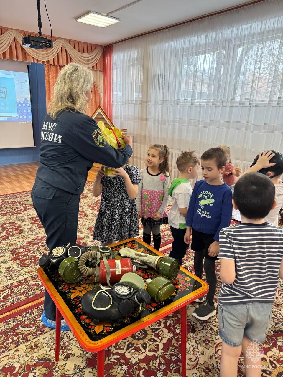 Мероприятие началось с рассказа о функциях и целях системы гражданской обороны, а также с демонстрации различных средств индивидуальной защиты, таких как противогазы, респираторы и самоспасатели. Дети с большим интересом примеряли эти средства и усваивали информацию в игровой форме. По завершении беседы они с энтузиазмом участвовали в словесных играх на пожарную тематику и дружно разгадывали загадки.