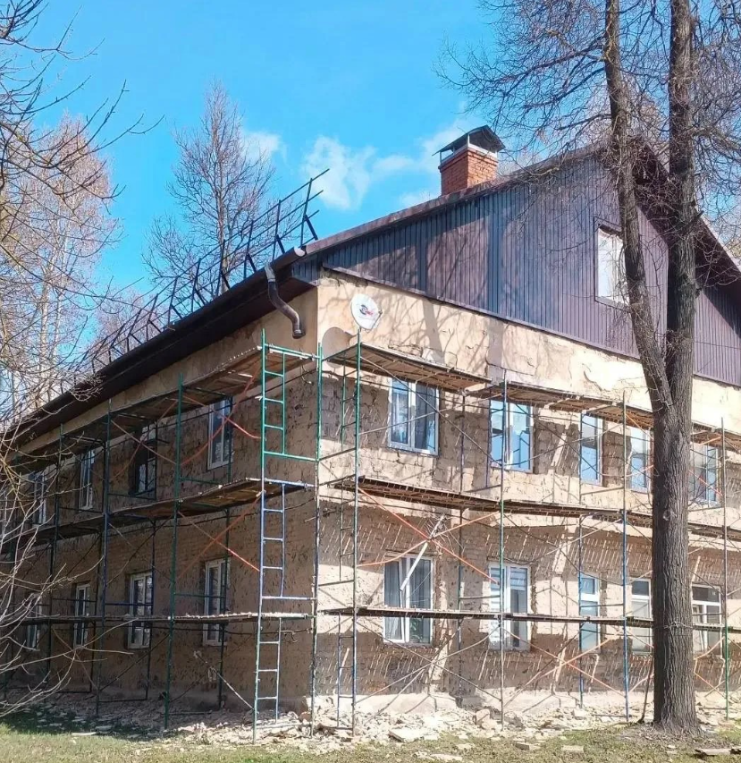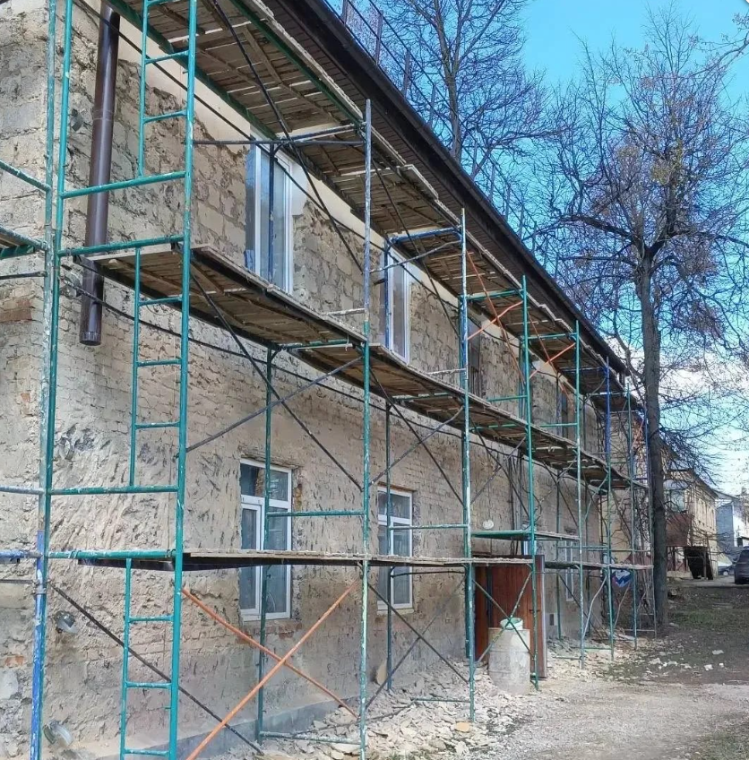 Строители сбивают старую штукатурку, демонтируют откосы и устанавливают строительные леса.